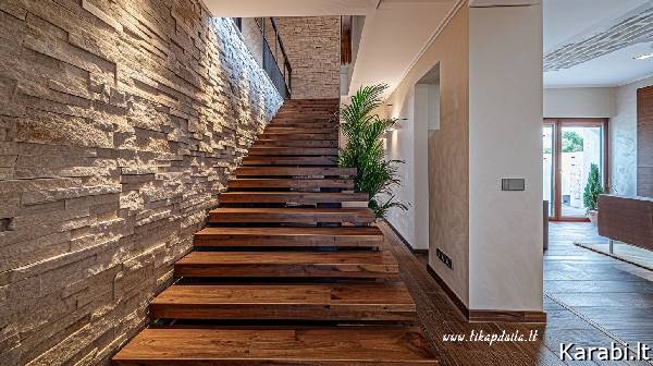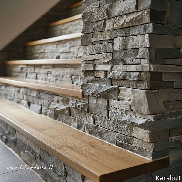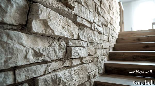 Betoninių laiptų apdaila dekoratyviniu akmeniu. Stilinga ir praktiška laiptų apdaila.