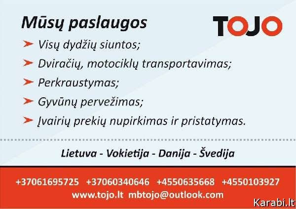 Lietuva-Danija-Lietuva. Siuntinių vežimas. Vežame nuo durų iki durų. Dirbame visą parą! Krovinių, siuntų vežimas į / iš Danijos. Perkraustymo paslaugos visoje Europoje. Kroviniai apdrausti CMR draudimu, išrašome sąskaitas faktūras. Dirbame su privačiais asmenimis ir su įmonėmis. KROVINIŲ PERVEŽIMAS Vežame siuntas ir didesnius krovinius, atliekame perkraustymo ir sandėliavimo paslaugas. Surenkame ir parvežame prekes iš įvairių aukcionų. Tarpininkaujame norintiems dalyvauti Danijos aukcionuose. Gabename siuntas ir didesnius krovinius (kubilus, pirtis, statybines medžiagas). Vežame automobilius, motociklus, keturračius, sodo traktoriukus bei kitą techniką. Žmonių pervežimas į / iš Daniją ir Šiaurės Vokietiją Asmens kelionė Lietuva Šiaurės Vokietija Lietuva Kopenhaga Lietuva Danijos žemynas Siuntų iki 35 kg pervežimas į / iš Daniją ir Šiaurės Vokietiją Lietuva Šiaurės Vokietija (lagaminas, krepšys, dėžė). Lietuva Kopenhaga (lagaminas, krepšys, dėžė). Lietuva Danijos žemynas (lagaminas, krepšys, dėžė). Krovinių pervežimas į / iš Daniją ir Šiaurės Vokietiją Dviratis Indaplovė, skalbimo mašina Motoroleris, motociklas, paletė Sodo traktoriukas Kubilas, sūkurinė vonia/jacuzzi Automobilis/auto TARPTAUTINIS PERKRAUSTYMAS Perkraustymo paslaugas teikiame Lietuvoje ir visoje Europoje. Kadangi kiekvienas perkraustymas yra individualus, susisiekite su mumis ir aptarsime jūsų norus, pageidavimus bei lūkesčius. Mūsų tikslas suteikti kokybišką perkraustymo paslaugą, tausojant kliento pinigus, laiką ir nervus. KROVININIŲ MIKROAUTOBUSŲ NUOMA Nuomojame maxi bazės krovininius mikroautobusus su ir be vairuotojo. Mikroautobusai tinkami vairuoti su B kategorija ir yra iki 3.5t bendro svorio. Galima gabenti krovinius iki 16 m3. VYKSTAME I SIUOS MIESTUS IR APLINK JUOS ESANCIUS MAZESNIUS MIESTELIUS: Utena, Panevezys, Vilnius, Kaunas, Siauliai, Klaipeda, Marijampole, Radviliskis, Ignalina, Alytus, Telsiai, Mazeikiai, Kedainiai, Taurage, Vilkaviskis, Rokiskis, Birzai, Anyksciai, Kretinga, Gargzdai, Silute, Prienai, Druskininkai, Lazdijai, Suvalkai, Augustovas, Bialystokas, Varsuva, Lodze, Poznane, Slubice, Berlynas, Hamburgas, Flensburgas, Koldingas, Esbjergas, Vejle, Horsensas, Silkeborgas, Herningas, Holstebro, Arhusas, Bilundas, Randersas, Tistedas, Alborgas, Skagenas, Grena, Odense, Slagelse, Holbekas, Roskilde, Hilerodas, Helsingioras, Koge, Nestvedas, Vordingborgas, Maribo, Falster, Nakskovas, Haderslevas, Hobro, Glostrupas, Herlevas. siuntos i danija, siuntos i danija kaina, siuntu gabenimas i danija, lietuva danija lietuva, mikroautobusai danija lietuva, kroviniu vezimas i danija, is danijos i lietuva, siuntiniai i lietuva, siuntos is danijos, vezu i danija, mikroautobusai i danija, siuntos is danijos i lietuva, lietuva danija siuntos, veza is danijos i lietuva, veža į daniją, vežėjai į daniją, vezame i danija, veza i danija, vezejai i danija, danija lietuva siuntos, siuntu vezimas i danija, siuntos lietuva danija, veza danija lietuva, vezejai danija lietuva, siuntos į daniją, danija lietuva vezejai, siuntos danija lietuva, danija lietuva, siunta i danija, i danija, mikriukai i danija, kroviniu pervezimas i danija, pigiai vezame i danija, siuntiniai i danija, lietuva danija, danija lietuva mikriukai, mikriukai danija lietuva, lietuva danija mikriukai, patikimi vezejai i danija. krovininiu mikroautobusu nuoma, krovininio autobusiuko nuoma, nuoma krovininiu mikroautobusu, mikroautobusu krovininiu nuoma, krovininiu autobusu nuoma, krovininio mikroautobusu nuoma, krovininio autobuso nuoma. kroviniu pervezimas kaina, pastas siuntiniu kainos, kroviniu vezimo kainos, kroviniu gabenimo kainos, kroviniu pervezimo kaina, krovinių pervežimo kainos, siuntiniu kainos, kroviniu pervezimas kaina. automobiliu transportavimas, automobilio transportavimas, automobilių transportavimas, kubilu vezimas, automobiliu vezimas i danija, automobilio transportavimas kaina, auto transportavimas, automobiliu vezimas. kraustymo paslaugos, tarptautinio perkraustymo paslaugos, perkraustymas, perkraustymo paslaugos, tarptautinis perkraustymas, baldu perkraustymas, baldų perkraustymas, tarptautinio perkraustymo paslaugos, perkraustymo. Tomas +37060340646, +4550103927. Jonas +37061695725, +4550635668. www.tojo.lt Kaina: 1 EUR
