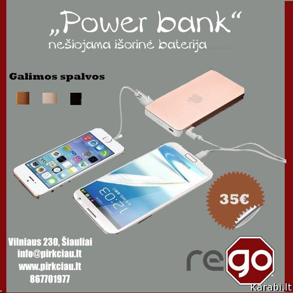 Power bank Kaina: 35 Daugiau informacijos: www.pirkciau.lt +37063977277, info@pirkciau.lt PRISTATYMAS VISOJE LIETUVOJE Daugkartinė nešiojama belaidė baterija su kuria įkrausite savo įrenginius nenaudojant elektros energijos. Tinka telefonams, kompiuteriams, navigacijoms, planšetėms... GALINGUMAS: 50000 mAH SPALVOS: auksinė; sidabrinė; juoda; JUNGTYS: mini ir micro USB; Galima pajungti savo laidus: iphone, Samsung, Nokia IŠMATAVIMAI: 70,5x40,5x23,5mm; Unikalaus dizaino universalus nešiojamas energijos šaltinis. Šis lengvas, nedaug vietos užimantis įtaisas leis bet kur ir bet kada pakrauti Jūsų išmaniuosius įtaisus. Jį galėsite naudoti daug kartų ir nebereikės jaudintis dėl nuolat išsikraunančio telefono ar planšetės. PASTABA: Jei turite klausimų, susisiekite nurodytais kontaktais: +370 639 77277 arba +370 677 01977, arba el.paštu info@pirkciau.lt. Priežiūros centro darbuotojai kuo skubiau suteiks Jums kvalifikuotą pagalbą. Adresas: Vilniaus g. 230, Šiauliai. El. Puslapis: www.pirkciau.lt Kaina: 35 EUR