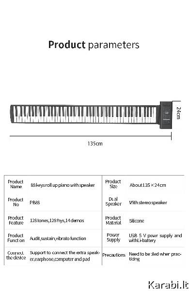 88 standartiniai klavišai kaip tikro pianino (įskaitant juodus klavišus).