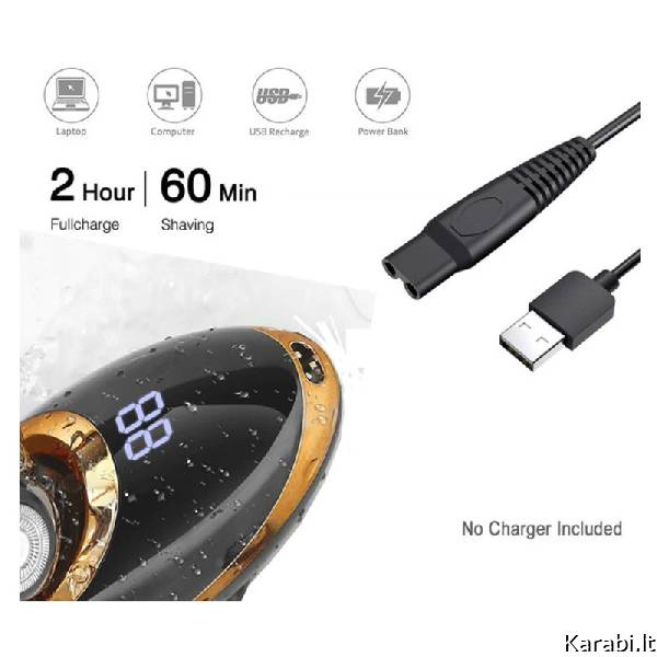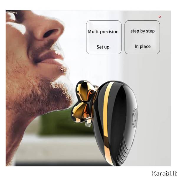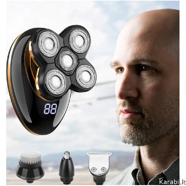 Dėl įmontuotos įkraunamos baterijos nereikia jaudintis dėl to, kad šalia nėra elektros kontakto. Jei pamiršote įkrauti, nereikia jaudintis, prijunkite prie įkrovimo laido ir naudokite toliau.as. Ašmenys pagaminti iš aukščiausios kokybės nerūdijančio plieno, yra aštrūs ir patvarūs. R formos peiliukai saugiam naudojimui lengvai kirpkite plaukus, nepažeisdami odos. 4 keičiamos kirpimo šukos su skirtingu pjovimo ilgiu, kurias lengva valyti. Mašinėlė skleidžia žemą triukšmo lygį ir turi vandeniui atsparų korpusą, kurį galite naudoti ir duše. Itin trumpas pjovimas, iki 0 mm, taip pat gali būti naudojamas graviravimui, barzdos formavimui. Kokybiški kirpimai namuose, naudojant ašmenų tvirtinimo technologiją, sumažinančią trintį tarp judančio peilio ir fiksuoto peilio, taip pat efektyviai sumažina triukšmą. Aukščiausios kokybės nerūdijančio plieno ašmenys su aštriu kampu. Visi plieniniai kampiniai peiliai yra saugūs, aštrūs ir atsparūs dilimui. Ergonomiškas dizainas: kompaktiškas korpusas patogiam naudojimui. Vidutinis dydis suteikia komforto jausmą. Korpusui panaudotos aukščiausios kokybės medžiagos, kurios neblunka po ilgo naudojimo. FUNKCIJOS: Šlapias ir sausas skutimasis. Lengvas valymas. Šis elektrinis skustuvas atsparus vandeniui Leidžia patogiai nusiskusti sausuoju būdu arba gaiviai nusiskusti drėgnuoju būdu su skutimosi kremu ar geliu duše. Šį elektrinį skustuvą galite nuplauti tiesiai po čiaupu, jį lengva valyti ir prižiūrėti. Ergonomiškai suprojektuota penkių galvučių skustuvo galvutė suteikia visišką kontrolę. Rotacinis skustuvas su judančiomis galvutėmis - prisitaiko prie kiekvieno veido, kaklo ir kūno kontūro, tiksliai šalina plaukelius. Nosies plaukelių kirptuvas - greitai nukerpa nepageidaujamus nosies plaukelius, taip pat puikiai tinka ausų plaukeliams. Šoninių kirpčiukų kirptuvas - puikiai tinka šoninėms sruogoms, ūsams kirpti. Į komplektą įeina priedai, kuriais galima reguliuoti kirpimo ilgį. Veido valymo šepetėlis - kruopščiai valo, pašalina prakaitą, nešvarumus ir riebalus. Padeda giliai ir kruopščiai išvalyti veido poras. Švelnesnis ir higieniškesnis būdas, nedirgina odos. Silikoninis valymo padėkliukas - nedirgina odos. Kaina: 45 EUR