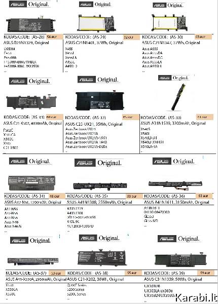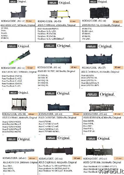 kaina: 17 vieta: Šiauliai / VISA LIETUVA ASUS ir kitų nešiojamų kompiuterių baterijos geriausia kaina! Nurodyti ne visi modeliai. Pristatymas visoje Lietuvoje per 1-2 d.d. (DPD kurjeriu, paštomatu, paštu, galima atsiimti vietoje). Visa konsultacija, remonto darbų užsakymas: +37063977277 / info@marsietis.lt / Vilniaus 230, Šiauliai arba Tilžės 107, Šiauliai Daugiau informacijos: www.marsietis.lt 1. VOLTAIC ASUS A32-K55, 5200mAh. A32-K55; A33-K55; A41-K55. Kaina 38 eur. 2. VOLTAIC ASUS A32-N56, 5200mAh. A31-N56, A32-N56, A33-N56. Kaina 35 eur. 3. VOLTAIC ASUS A32-M50, 5200mAh. A32-M50; A32-N61; A33-M50; A32-X64; L072051; 15G10N373830; 15G10N373800; 90-NED1B2100Y. Kaina 35 eur. 4. VOLTAIC ASUS A32-K52, 5200mAh. 70-NXM1B2200Z; 90-NYX1B1000Y; A31-K52; A32-K52; A41-K52; A42-K52; A31-B53; K52L681. Kaina 35 eur. 5. VOLTAIC ASUS A41-X550, 4400mAh. A41-X550; A41-X550A. Kaina 35 eur. 6. VOLTAIC ASUS A41N1308, 2600mAh. 0B110-00250100; A41N1308; A31LJ91; A31N1319; A41N1308; X45LI9C; YU12008-13007D; YU12125-13002. Kaina 35eur. 7. VOLTAIC ASUS B21N1329, 4040mAh. 0B200-00840000; B21N1329. Kaina 36 eur. 8. VOLTAIC ASUS A32-K56, 2200mAh. A31-K56; A32-K56; A41-K56; A42-K56. Kaina 25 eur. 9. VOLTAIC ASUS A32-K53, 4400mAh. A32-K53; A42-K53. Kaina 26 eur. 10. VOLTAIC ASUS A41-X550, 2200mAh. A41-X550; A41-X550A. Kaina 11.00 eur. 11. VOLTAIC ASUS A41-X550E, 2600mAh. Kaina 33 eur. 12. VOLTAIC ASUS X540 Series A31N1519, 2600mAh. Kaina 30 eur. 13. VOLTAIC ASUS C21N1347, 4900mAh. Kaina 45 eur. 14. VOLTAIC ASUS A31N1601, 2600mAh. 0B110-00440000. Kaina 28 eur. 15. VOLTAIC ASUS A31N1537, 2600mAh. 0B110-00420300. Kaina 28 eur. 16. ASUS C21N1508, 38Wh, Original. Kaina 33 eur. 17. ASUS c31-s551, 48Wh, Original. Kaina 50 eur. 18. ASUS U38N, 6520mAh, Original. UX32 Series Zenbook UX32A; Zenbook UX32VD; VivoBook U38N Series; VivoBook U38N-C4004H. Kaina 88eur. 19. ASUS C41-N550, 59Wh, Original. Kaina 90 eur. 20. ASUS C31-X502, 38Wh, Original. Kaina 40 eur. 21. ASUS A41N1424, 48Wh, Original. A41N1424; X55LM2H; 0B110-00231100; 0B110-00231100M. Kaina 52 eur. 22. ASUS B21N1329, Original. Kaina 54 eur. 23. ASUS C21N1401, 37Wh, Original. C21IN401; C21INI401; C21N1401. Kaina 32 eur. 24. ASUS C21N1347, 37Wh, Original. Kaina 63 eur. 25. ASUS C21-X502, 4000mAh, Original. C21-X502; C21-X502CA. Kaina 60 eur. 26. ASUS C23-UX21, 35Wh, Original. Kaina 65 eur. 27. ASUS A31N1519, 3200mAh, Original. Kaina 43 eur. 28. ASUS A32-N56, 5200mAh, Original. A31-N56; A32-N56; A33-N56. Kaina 48 eur. 29. ASUS A41N1308, 2550mAh, Original. A31N1319; A41N1308; 0B110-00250100M; X45LI9C; YU12008-13007D. Kaina 53 eur. 30. ASUS A41N1611, 3150mAh, Original. 0B110-00470000. Kaina 53 eur. 31. ASUS A41-X550A, 2950mAh, Original. A41-X550A; 0B110-00230100; 0B110-00230100M. Kaina 53 eur. 32. ASUS C21-X202, 38Wh, Original. Kaina 55 eur. 33. ASUS C31N1339, 50Wh, Original. 0B200-9300000; 3ICP7/55/90. Kaina 59 eur. 35. ASUS C31N1428, 56Wh, Original. C3INI428; C31N1428; C31NI428; C31PQC1; C3IN1428. Kaina 50 eur. 36. VOLTAIC ASUS A32N1405, 5200mAh. G551; N551; N751; G58; G771; A32N1405. Kaina 50 eur. 37. VOLTAIC ASUS A32N1405, 5200mAh. G551; N551; N751; G58; G771; A32N1405. Kaina 50 eur. 38. VOLTAIC ASUS B31N1726, 4240mAh. B31N1726. B31N1726-1. B31BnEH. B31Bn91. A41LK9H. Kaina 35 eur. 39. ASUS C21N1509, 5000mAh, Original. 0B200-01750000. Kaina 48 eur. 40. ASUS A32N1331, 44Wh, Original. A32N1331; A33N1332. Kaina 43 eur. 41. ASUS C22-UX31, 6840mAh, Original. Kaina 70 eur. 42. ASUS B21N1505, 32W, Original. Kaina 50 eur. 43. ASUS C31N1528, 4680mAh, Original. Kaina 58 eur. 43. ASUS C32-N750, Original. Kaina 70 eur. 44. ASUS C31N1620, 4335mAh, Original. 0B200-03420200. 3ICP5/70/81. C31N1620. C31N1620, C31N162O, C3iNi62O, C3iNi620, C3iPOJi, C31POJ1, C3iP0Ji, C31P0J1, 0B200-02860000, 0B200-02370000, 0B200-02370200, 0B200-02370100. Kaina 70 eur. 45. ASUS C21N1638, 4940mAh, Original. Kaina 35 eur. 46. ASUS A31N1719, 2900mAh, Original. A31N1719. 0B110-00520500. 0B110-00520200. A31L04Q. A31N11719-1. Kaina 50 eur. 47. ASUS B31N1637, 3653mAh, Original. B31N1637. C31N1637. B31BI2H. 0B200-02590000. 0B200-02590100. 0B200-02590200. 0B200-02590300. B31Bi2H. B31Bi9H. Kaina 60 eur. 48. ASUS C21N1634, 5000mAh, Original. B31N1637. C31N1637. B31BI2H. 0B200-02590000. 0B200-02590100. 0B200-02590200. 0B200-02590300. B31Bi2H. B31Bi9H. Kaina 53 eur. 49. ASUS A31N1601, 3350mAh, Original. A31N1601. A31N1537. A31LP4Q. Kaina 45 eur. 50. ASUS B31N1707, 3653mAh, Original. 0B200-02710000. B31N1707-1. Kaina 65 eur. 51. ASUS C41N1531, 4120mAh, Original. 0B200-01940100. Kaina 80 eur. 52. ASUS C31N1431, 4840mAh, Original. 0B200-01600200. 0B200-01600300. 0B200-01600000. 0B200-01600400. Kaina 62 eur. 53. ASUS C41N1541, 5000mAh, Original. 0B200-02070000. 0B200-02070200. 0B200-02070300. C41PP91. Kaina 75 eur. 54. ASUS B31N1424, 4240mAh, Original. 0B200-01390000. Kaina 61 eur. 55. ASUS A31N1319, 2900mAh, Original. A31N1319. A31LJ91. A31LJ21. A31L04G. Kaina 60 eur. 56. ASUS C42N1630, 4652mAh, Original. 0B200-02520000. 4ICP5/41/75-2. C42N1630. C42PHCH.. Kaina 100 eur. 57. ASUS C31N1806, 3550mAh, Original. 0B200-02960000. 0B200-03030000. 0B200-03030100. 3ICP5/58/78. C31N1806. C31PIJ1. Kaina 72 eur. 58. ASUS B31N1822, 3550mAh, Original. B31N1822. 0B200-03220000. 0B200-03220100. 3ICP5/57/80. B31Bi2H. B31BIEH. B31B1EH. Kaina 68 eur. 59. ASUS C41N1524, 4755mAh, Original. C41N1524. 0B200-01250200. Kaina 75 eur. 60. ASUS C31N1602, 4940mAh, Original. 0B200-02090000. Kaina 73 eur. 61. ASUS C41N1712, 3255mAh, Original. C41N1712. 0B200-02380100. 0B200-02380200. 4ICP4/72/75. C41PKC5. Kaina 59 eur. 62. ASUS C21N1714, 5065mAh, Original. 0B200-02740000. Kaina 70 eur. 63. ASUS C21N1818-1, 4850mAh, Original. Asus C21n1818-1. Asus C21N1818. Asus 0B200-03280500. Asus C21PpJH. Asus 0B200-03190800. Asus 2ICP7/54/83. Asus C21PPJH. Kaina 58 eur. 64. ASUS B31N1632, 3653mAh, Original. B31N1632. 0B200-02540000. 0B200-02540300. Kaina 73 eur. 65. ASUS C21N1333, 4900mAh, Original. C21N1333. 0B200-00860000. 0B200-00860100. 0B200-008602