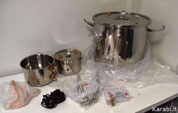 30l, 3 indai su siurbliuku. Supakuotas, tinka dovanai, yra instrukcija Distiliatoriaus rinkini sudaro: vienas 30l nerudijancio plieno katilas, vienas kondensatorius su saldančiu nerudijancio plieno vamzdeliu, vienas papildomas kondensato sodrinimo puodas, vienas oro voztuvas fermentavimui, vienas termometras, vienas isleidimo voztuvas ir du silikoniniai vamzdeliai, du gofruoto, nerudijancio plieno vamzdeliai, termometras, elektrine vandens pompa. Kaunas, kitur siunciu betkokiu patogiu Jums budu Turiu dar 20l talpos Kaina: 145 EUR
